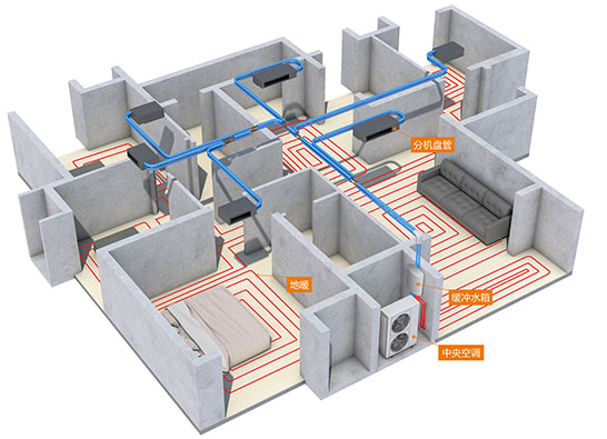 冷媒(氟利昂)只在室外機內循環,通過換熱器換熱給水,室內機循環的是冷水或熱水,舒適度高。